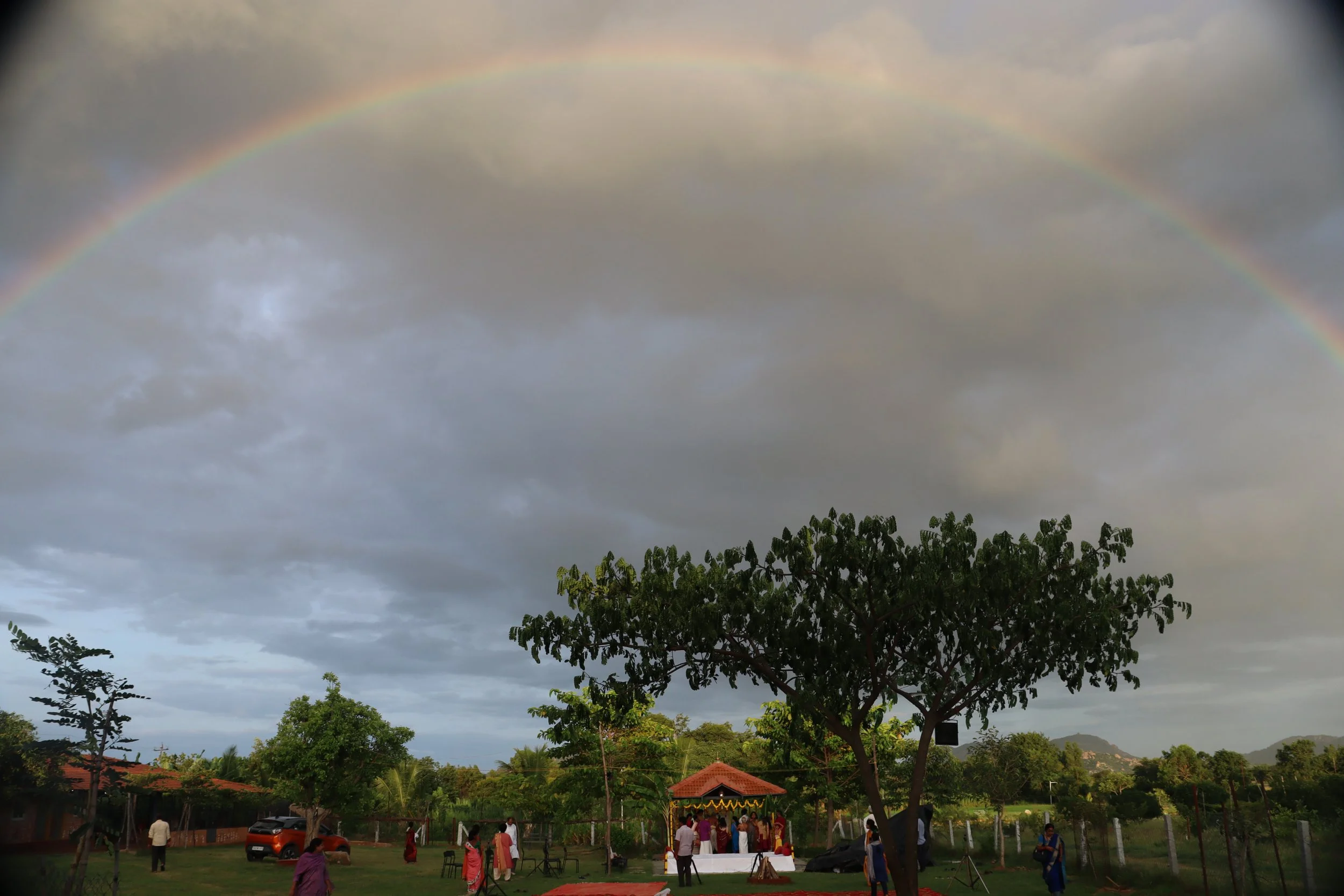 The retreat opened with Seva and Shravana sessions on August 15. As noon turned to dusk, a beautiful rainbow appeared in the sky as if to bless the gathering assembled for the evening Abhishek and Arti of our beloved Madanagopala. By his grace, the evening unfolded without rain, culminating in the blissful midnight celebration of Sri Krishna Janam.