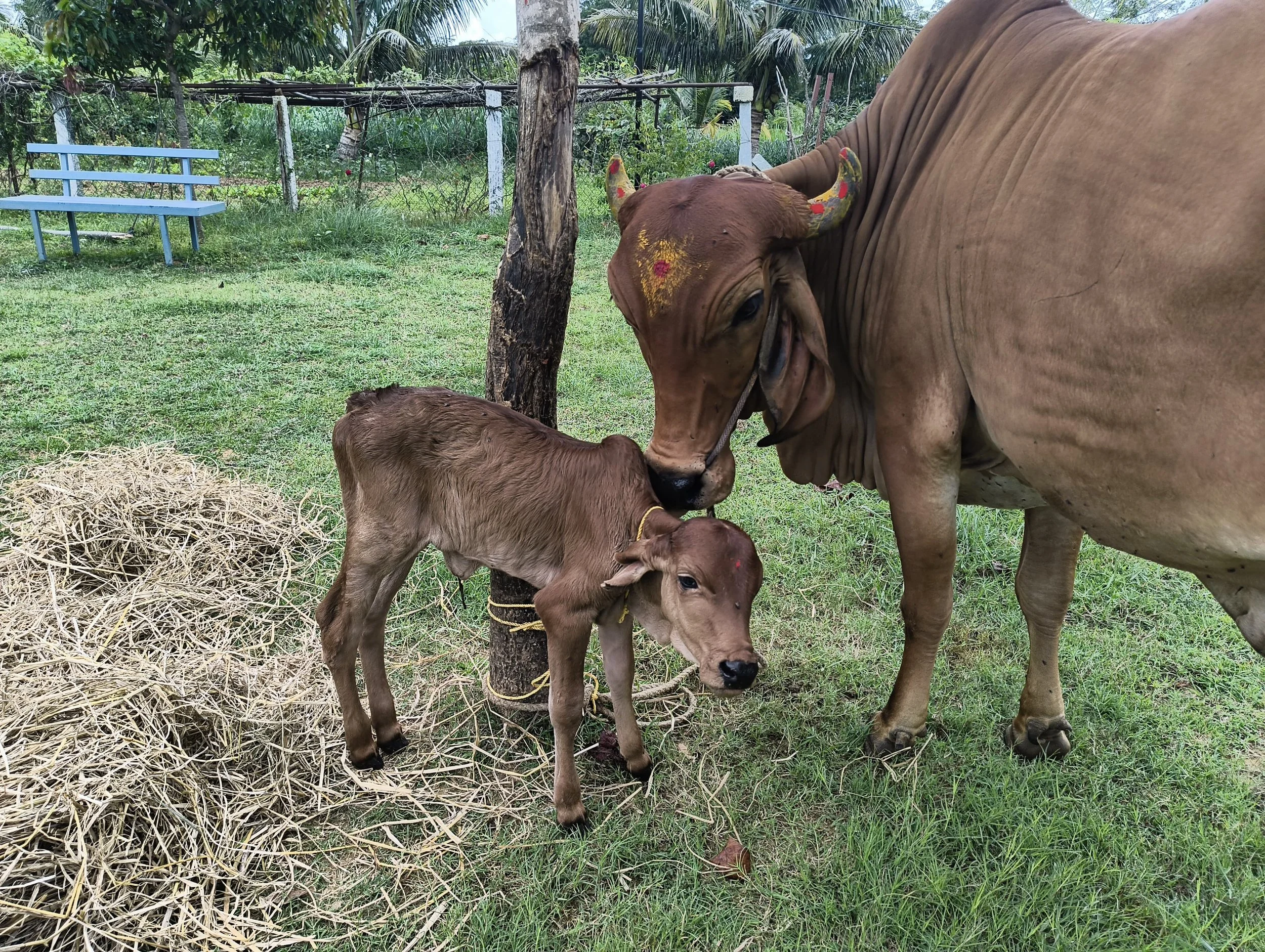 On the sacred day of Ekadashi, a very special blessing arrived at the Sacred Grove Goshala. Our gentle cow Nandini gave birth to a beautiful calf, and in honour of the auspicious day, the newborn has been named Ekadashi. Both mother and calf are healthy, and everybody at Sacred Grove is filled with joy and gratitude. The birth of every calf at the Sacred Grove is experienced with the same intensity and care as that of a woman giving birth to a child. The labour pains make the caregivers anxious, and any delay in delivery is closely monitored by the veterinarian. Throughout this time, the goshala staff sat patiently, watching over the mother with deep concern, ready to step in the moment help is needed. Once the calf is born, attention turns to the mother ensuring the placenta clears completely and is carefully disposed off so that she does not swallow it by mistake. The newborn is gently fed, and the mother is milked to prevent any risk of infection. And finally, after this delicate process of care and watchfulness, comes the moment of joy - the name-giving ceremony that celebrates not just the arrival of a calf, but the continuation of a sacred cycle of life.