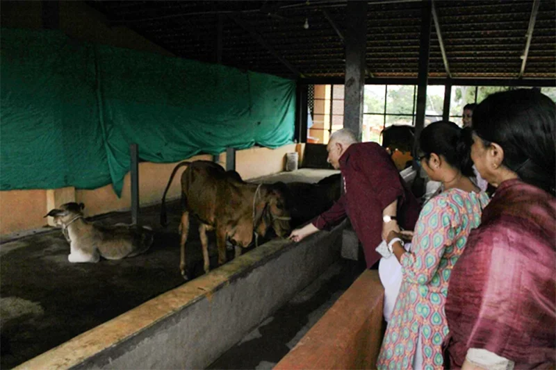 The Goshala today houses 21 cows, supporting the kitchen requirements with fresh milk and ghee, providing cow dung for natural farming, and offering seekers an opportunity to connect closely with cows and bulls during their retreat.